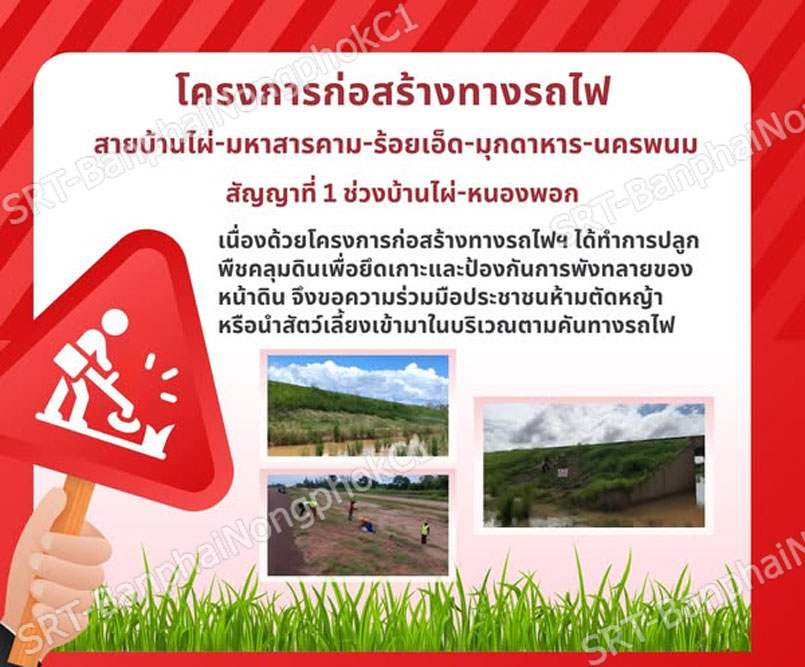 | 📢 ข่าวประชาสัมพันธ์ของทางโครงการก่อสร้างทางรถไฟสายบ้านไผ่-มหาสารคาม-ร้อยเอ็ด-มุกดาหาร-นครพนม (สัญญาที่ 1 ช่วงบ้านไผ่-หนองพอก) เนื่องด้วยโครงการก่อสร้างทางรถไฟฯ ได้ทำการปลูกพืชคลุมดินเพื่อยึดเกาะและป้องกันการพังทลายของหน้าดิน จึงขอความร่วมมือประชาชนห้ามตัดหญ้าหรือนำสัตว์เลี้ยงเข้ามาในบริเวณตามคันทางรถไฟ |